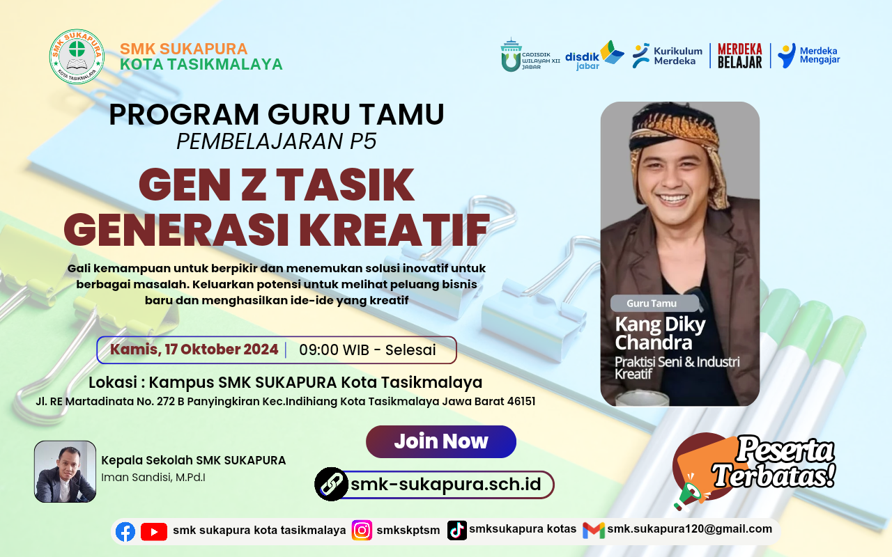 Dalam waktu dekat, Diky Chandra akan menjadi Guru Tamu dalam acara Seminar yang bertemakan “Gen Z Tasik Generasi Kreatif” yang akan dilaksanakan di SMK SUKAPURA Kota Tasikmalaya, Kamis (17 Oktober 2024).